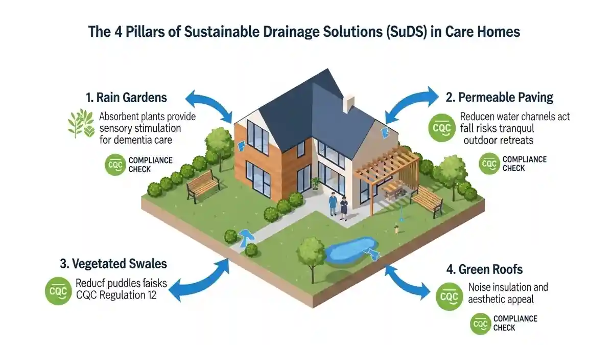 The future of sustainable drainage solutions CQC care home design is the integration of SuDS (Sustainable Drainage Systems). In Sunbury on Thames, Policy EN18 of the Local Plan encourages SuDS to manage surface water runoff, which often plagues the surrounding area.